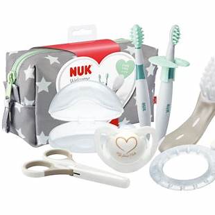 NUK Welcome set: Obsahuje základní pomůcky pro novorozence, jako je dudlík, kartáč na vlasy, nůžky na nehty a další. nuk.cz