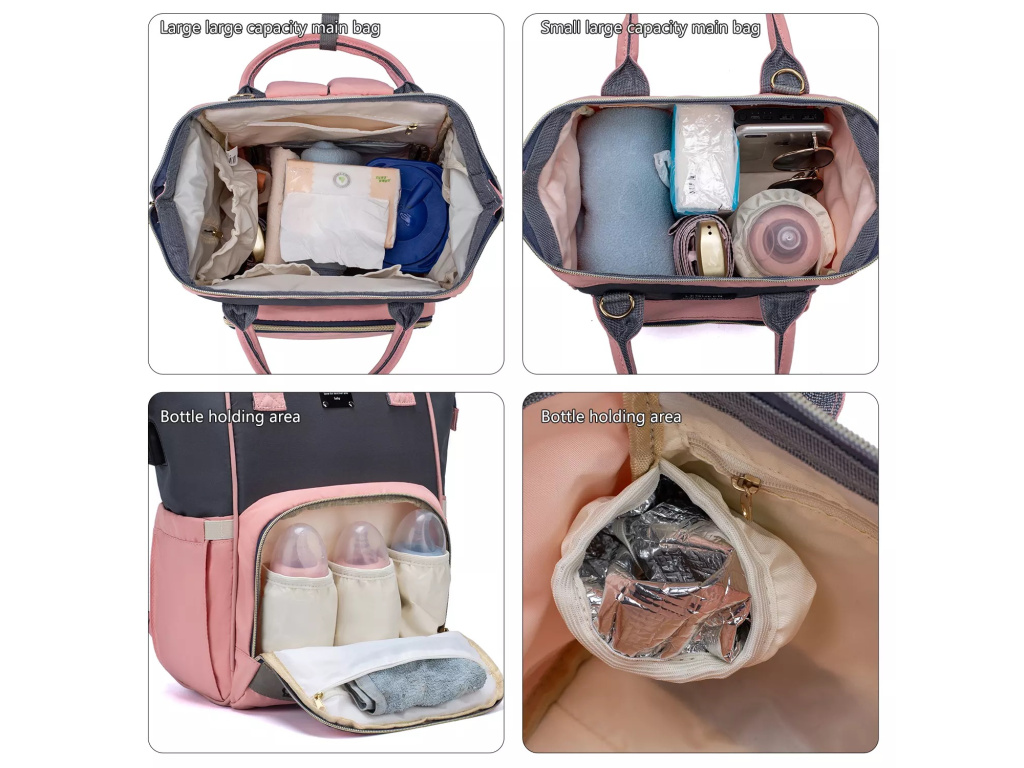 - Přední kapsa: Všité tři termokapsy, které udrží mléko nebo polévku vždy teplou. Ohřívač lahviček jako příslušenství k batohu. Síťová přihrádka na drobné věci, které potřebujete mít při ruce.