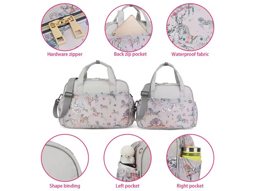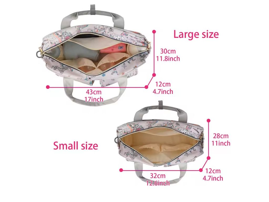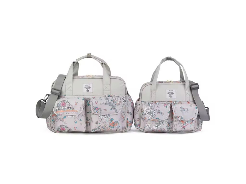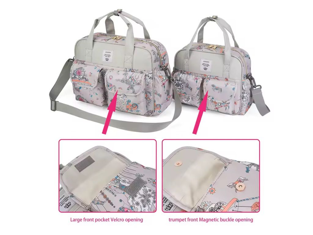 Stylový set dvou kabelek v elegantním designu je ideální jako sladěná sada pro maminku a dceru, nebo jako kombinace přebalovací tašky na kočárek a menší přebalovací kabelky pro maminku. Obě tašky jsou vyrobené z voděodolného materiálu, nabízí množství kapes pro dokonalou organizaci a díky dvěma velikostem se přizpůsobí každodenním potřebám.
