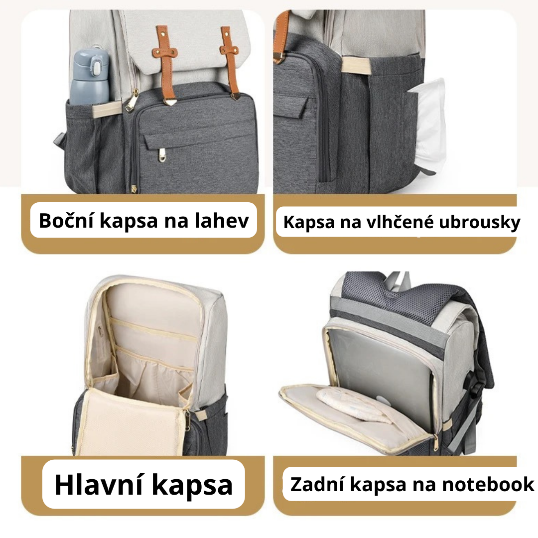 Díky dlouhému vývoji mohl být batoh vyroben s ohledem na opravdové zkušenosti a potřeby maminek, a tak oceníte například boční kapsu s otvorem na vlhčené ubrousky pro každou nenadálou situaci. Žádná maminka nechce ztrácet drahocenný čas, a proto má batoh v přední části termokapsy, které udrží lahvičku s mlékem či polévkou v teple a vy tak můžete miminko nakrmit bez zbytečného zdržování.