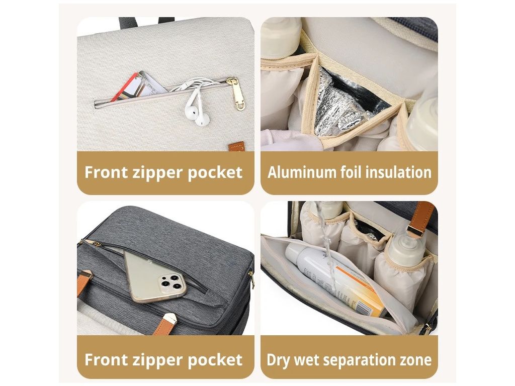 - Přední kapsa: Všité tři termokapsy, které udrží mléko nebo polévku vždy teplou. Síťová přihrádka na drobné věci, které potřebujete mít při ruce.