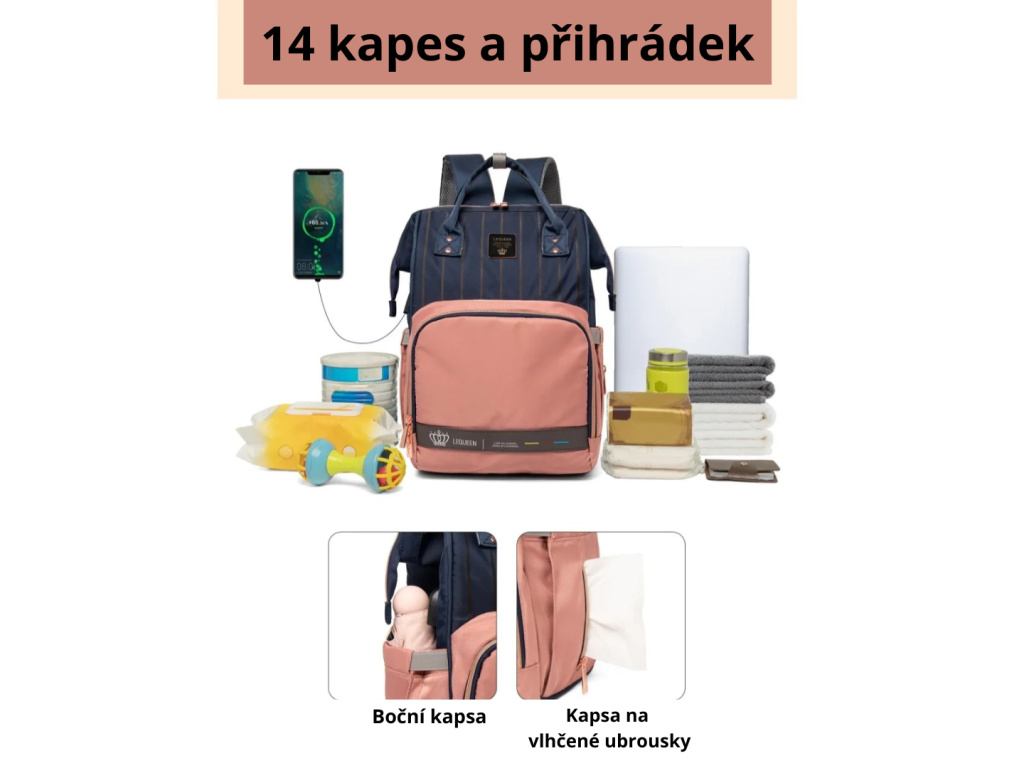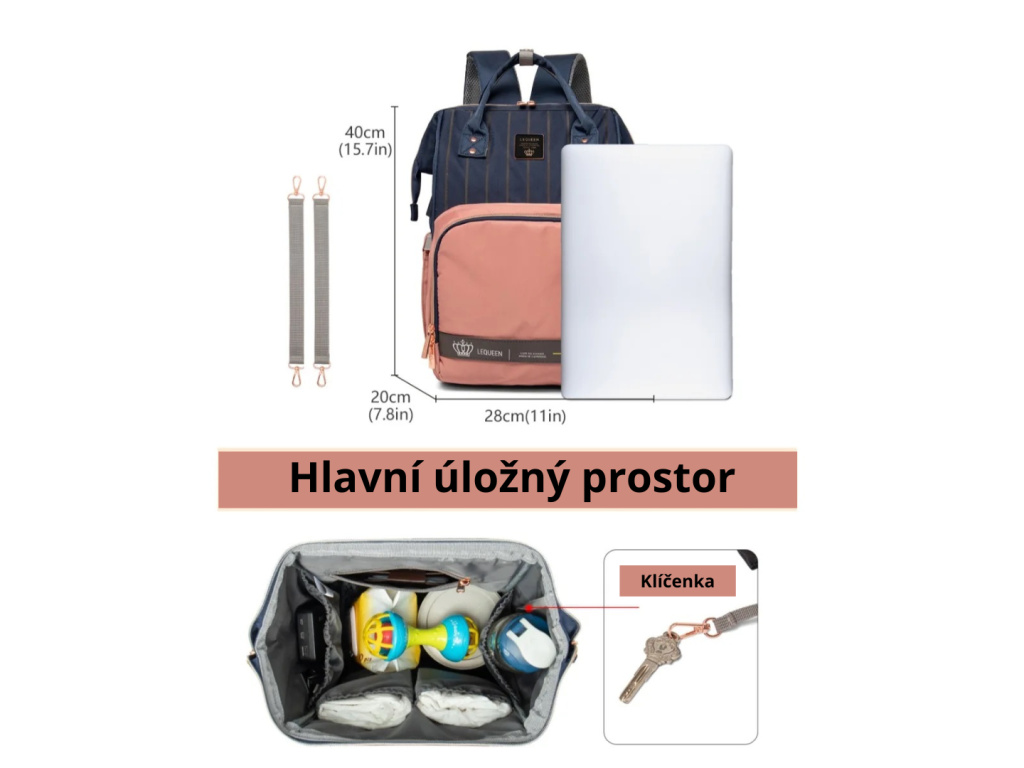 Designový přebalovací batoh pro stylové maminky. Vhodný na kočárek jako přebalovací taška nebo na záda jako batoh. Velice užitečný pomocník na cestách s miminkem.