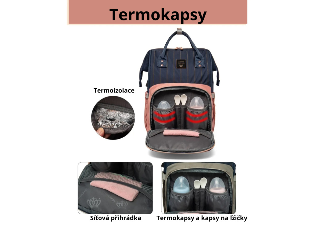 Díky dlouhému vývoji mohl být batoh vyroben s ohledem na opravdové zkušenosti a potřeby maminek, a tak oceníte například boční kapsu s otvorem na vlhčené ubrousky pro každou nenadálou situaci. Žádná maminka nechce ztrácet drahocenný čas, a proto má batoh v přední části termokapsy, které udrží lahvičku s mlékem či polévkou v teple a vy tak můžete miminko nakrmit bez zbytečného zdržování.