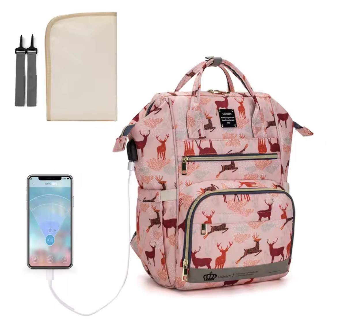 - USB port: Z boku na batohu k nabíjení mobilu nebo ohřívače lahviček.