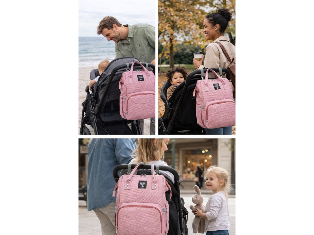 - Velká kapacita a promyšlené vnitřní uspořádání – více kapes pro přehledné uložení plen, lahviček, oblečení a drobností.