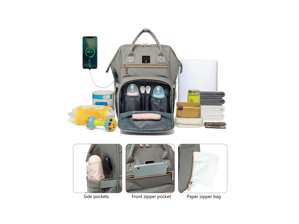 - USB port: Z boku na batohu k nabíjení mobilu nebo ohřívače lahviček.