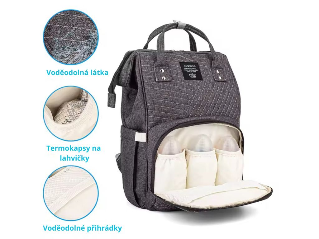 - Obsah balení: přebalovací batoh, 2 popruhy pro zavěšení na kočárek a termoobal na lahvičku